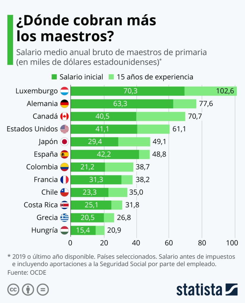 Por ejemplo, un docente con poca experiencia puede ganar alrededor de 1.200 euros al mes, mientras que uno con más de 25 años de experiencia puede llegar a ganar más de 2.500 euros al mes.